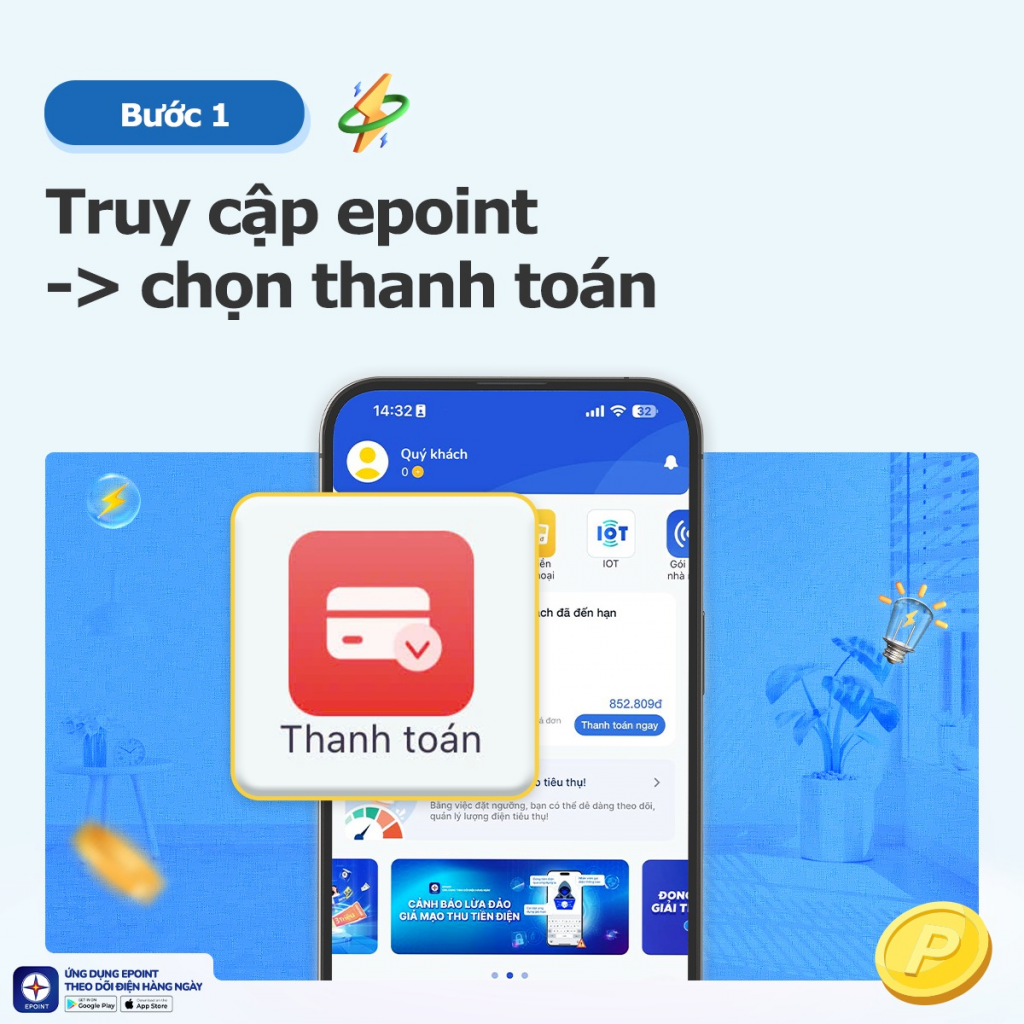 EPoint không chỉ giúp Quý khách thanh toán hóa đơn điện nhanh chóng mà còn là người bạn đồng hành trong việc theo dõi lượng điện tiêu thụ hàng ngày, từ đó giúp Quý khách tối ưu hóa việc sử dụng điện một cách hiệu quả và tiết kiệm.
