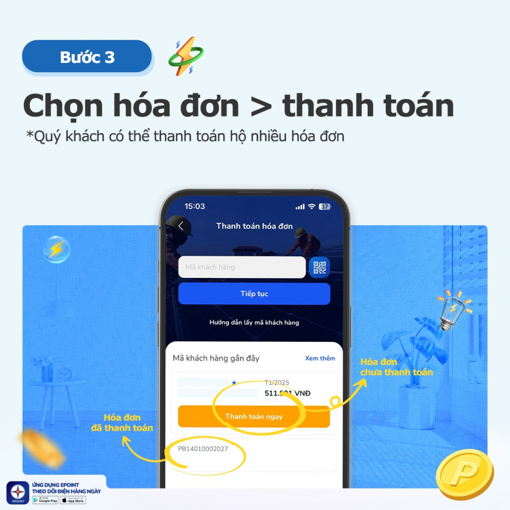 Hóa đơn tiền điện tháng 03 đã được cập nhật đầy đủ trên EPoint. Để đảm bảo không xảy ra gián đoạn dịch vụ, Quý khách vui lòng kiểm tra và thanh toán đúng hạn.